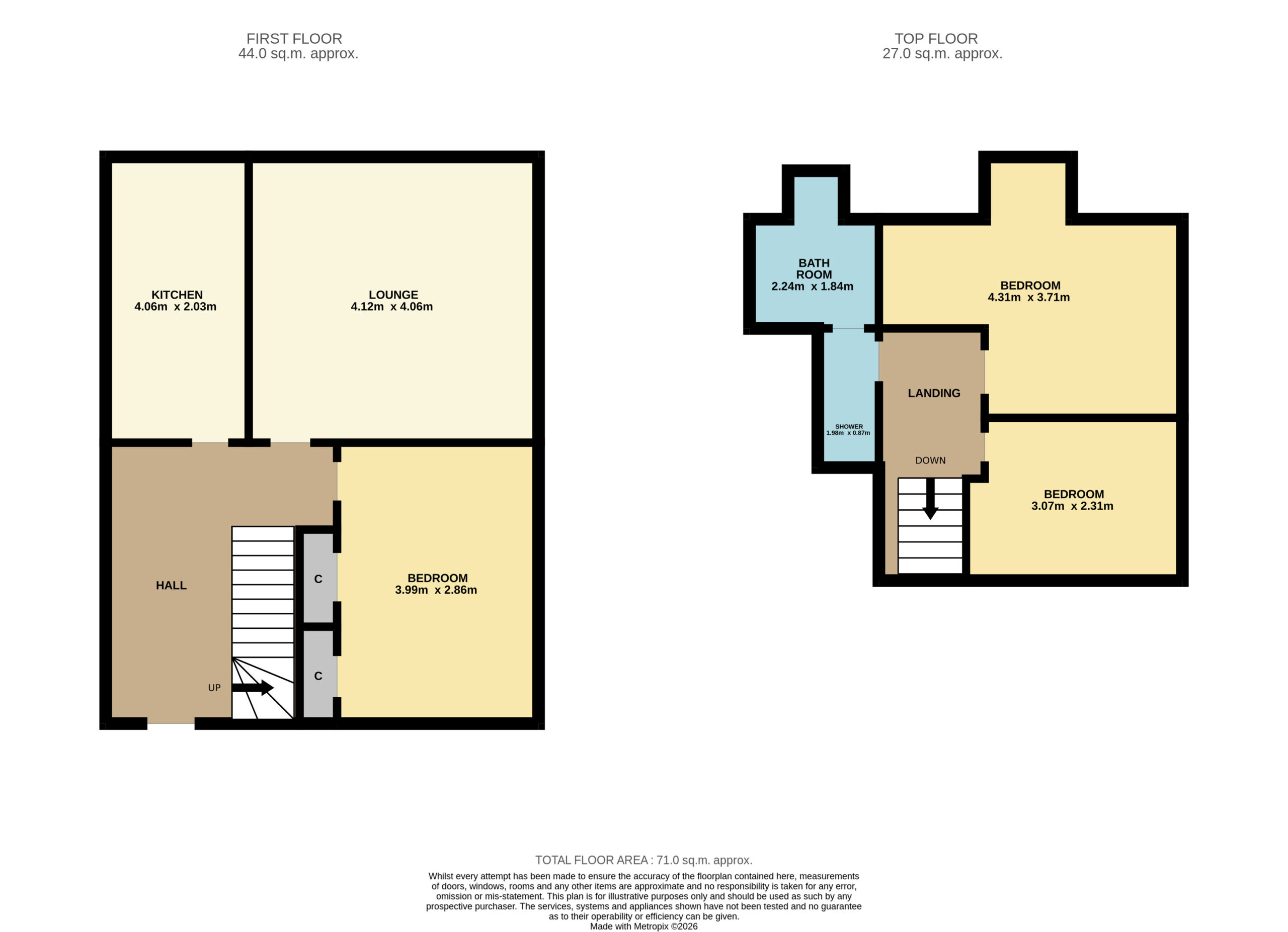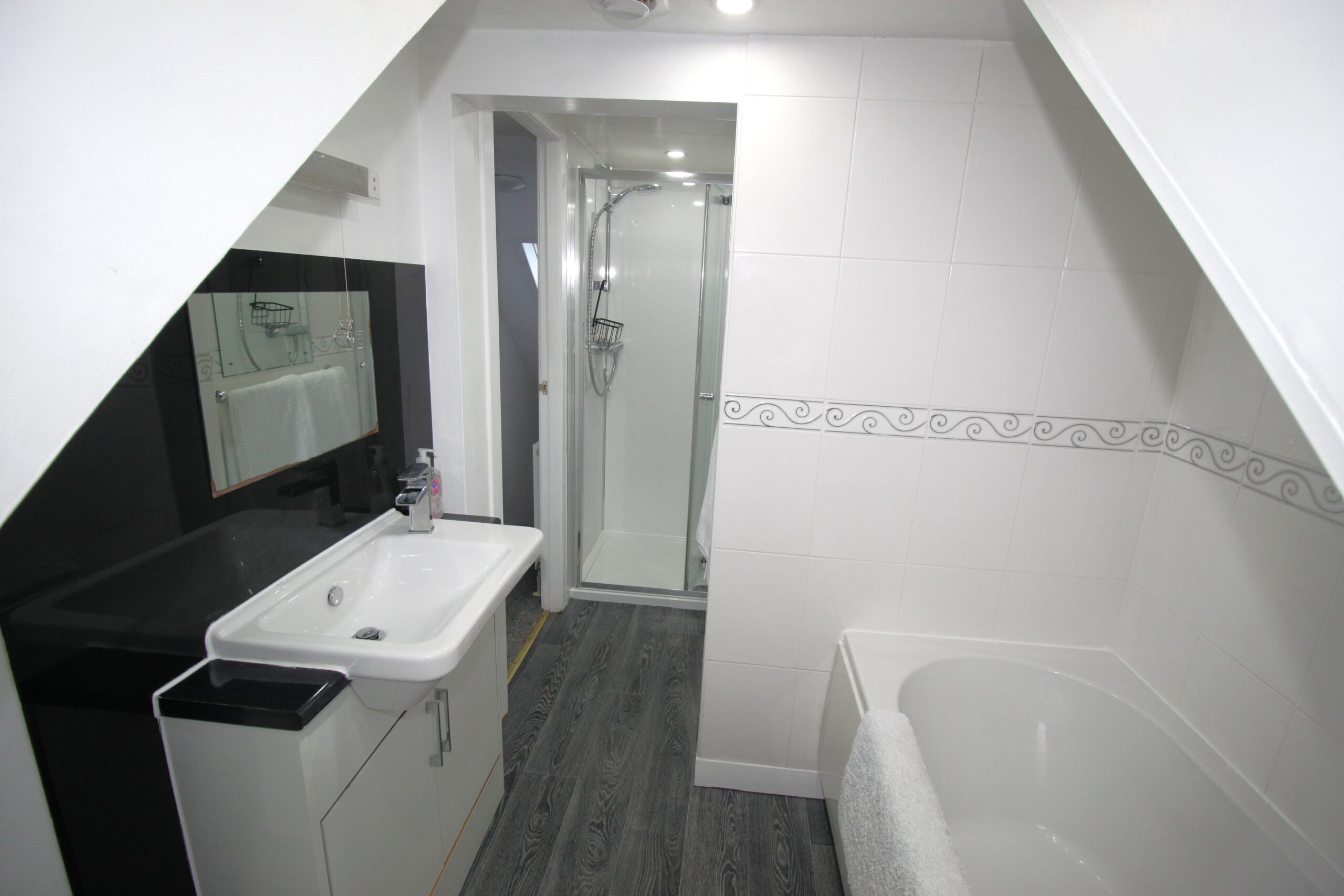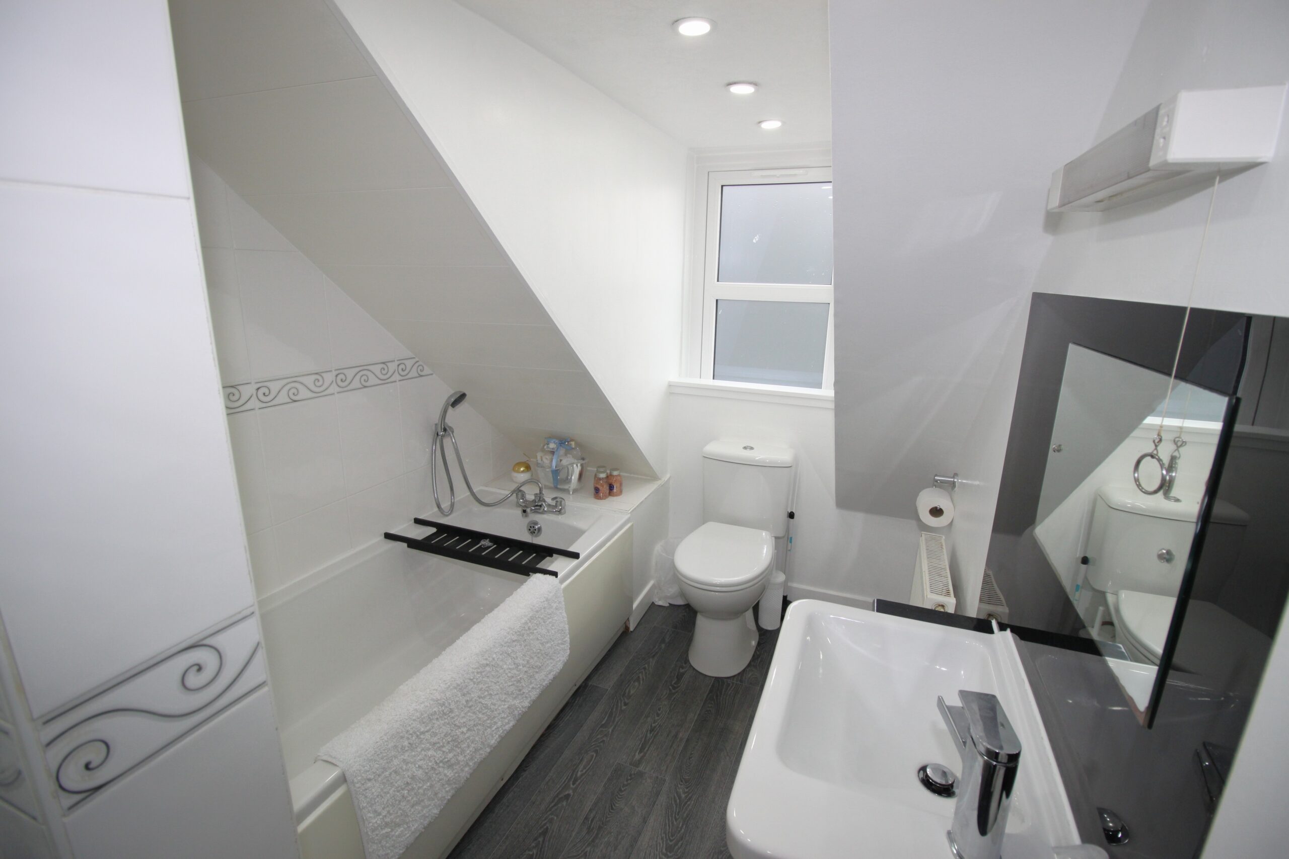 The top floor is completed by a contemporary, easily maintained partially tiled bathroom with shower over bath facility, standalone sink unit and a separate shower enclosure with mains powered shower.