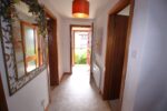 Tiled vestibule hallway with storage cupboard and partially floored attic.