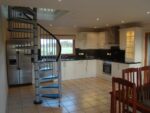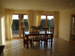 Large fully equipped kitchen with large space for family or dining area, floor to ceiling French windows leading to a patio area at the back of the property.