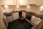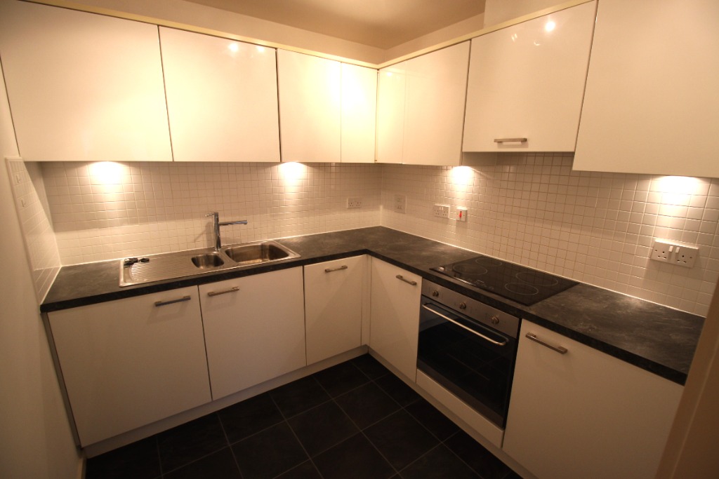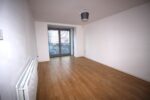 The living room is a bright and airy space with a large patio door that lets in plenty of natural light and leads to a balcony. The kitchen is fitted with oven/ hob as well as a fridge, freezer and dishwasher.