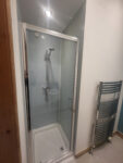 Modern shower room with mains powered shower, stylish tile effect wet wall and heated towel rail.
