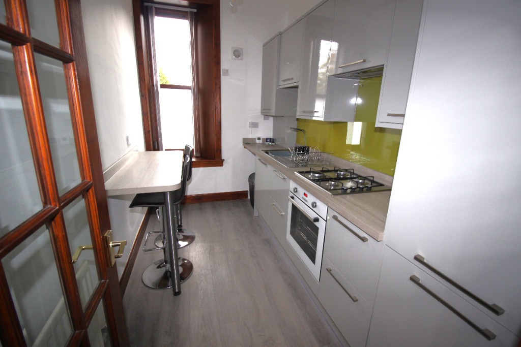 Contemporary kitchen with breakfast bar area , integrated oven and full size, integrated fridge freezer.